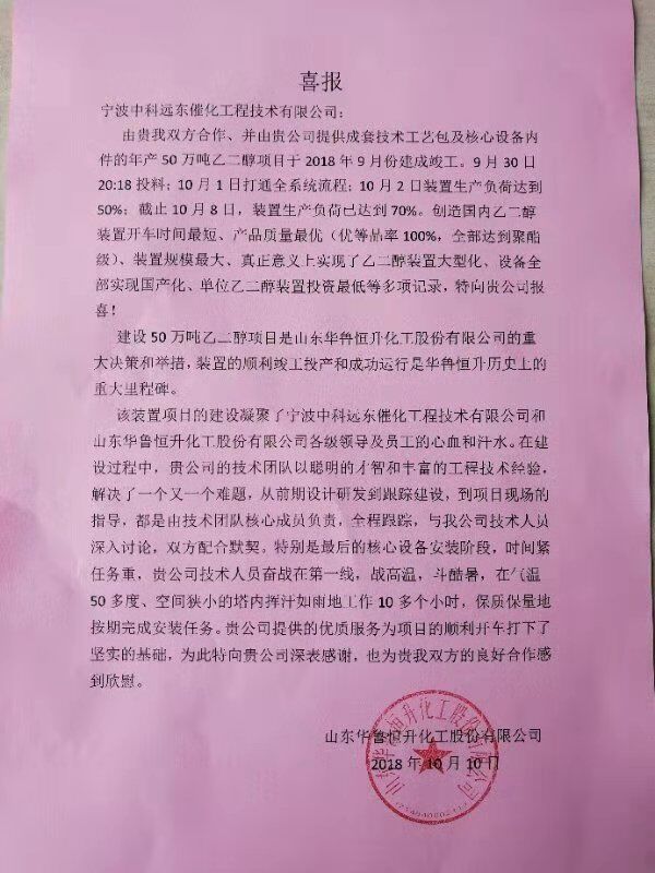 在設(shè)計(jì)和建設(shè)過程中,中科遠(yuǎn)東的設(shè)計(jì)團(tuán)隊(duì)以聰明的才智和豐富的設(shè)計(jì)經(jīng)驗(yàn),解決了一個(gè)又一個(gè)難題,從前期設(shè)計(jì)研發(fā)到跟蹤建設(shè),到開車現(xiàn)場(chǎng)的指導(dǎo),都是由技術(shù)團(tuán)隊(duì)核心成員負(fù)責(zé),全程跟蹤,與華魯恒升技術(shù)人員深入討論,雙方配合默契。為此,山東華魯恒升化工股份有限公司公司發(fā)來喜報(bào),感謝寧波中科遠(yuǎn)東催化工程技術(shù)有限公司在此過程中提供的優(yōu)質(zhì)技術(shù)和優(yōu)良服務(wù)。